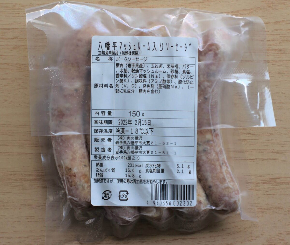 八幡平マッシュルーム入りソーセージ1パック5本入り(150g)×3パック・・・税込み2700円(送料無料)